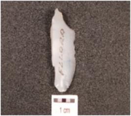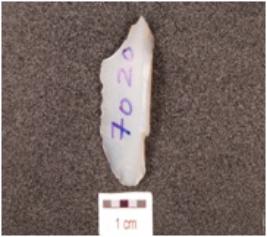 | Description / विवरण | A flake made of chalcedony, flake scars on dorsal side, wavy cutting edges and smooth surface. |