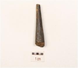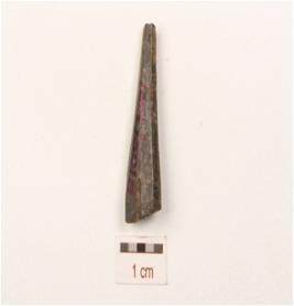 | Description / विवरण | A fragment of point made on bone, upper part broken, slightly missing working edge and circular cross section. |