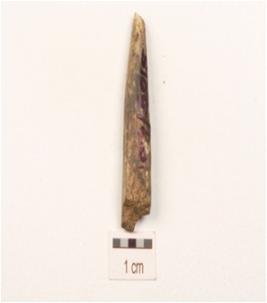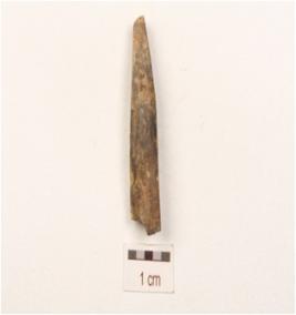 | Description / विवरण | A fragment of point made on bone, upper part broken and missing working edge and plano-convex cross section. |