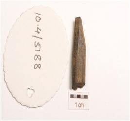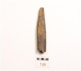 | Description / विवरण | Bone point, both ends partly broken oval cross section, smooth and polished surface, charred. |