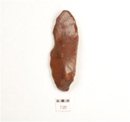 | Description / विवरण | Chert, side scraper on end struck flake, striking platform, bulb on ventral side, prominent ridge on dorsal side, blunt working edge and triangular cross section, |