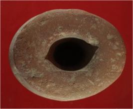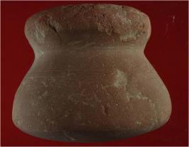 | Description / विवरण | Trench XG 7- XG 8, mid baulk layer 2 It is a dabber made of terracotta. There are many cut marks present on it. Shape is ghat like and surface is rough with brick brown appearance. Broad hole is present in it. |