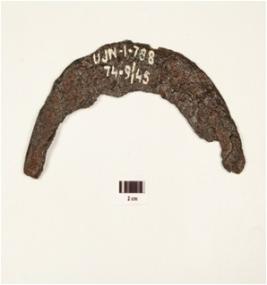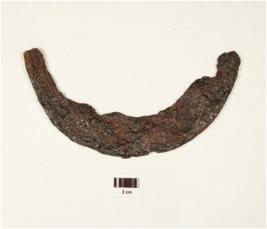 | Description / विवरण | Fragment of iron sickle, crescent shape, irregular edges, handle missing, rough and chemically treated surface, |