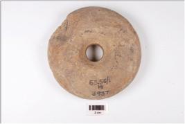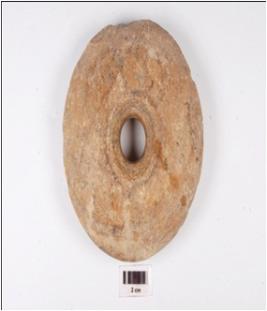 | Description / विवरण | A macehead made of chert, discular in shape, slightly chipped off on the surface and perforated |