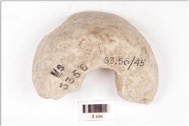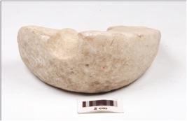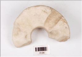 | Description / विवरण | Fragment of a macehead made of marble, plano convex cross section, chipped off on interior surface and perforated. |