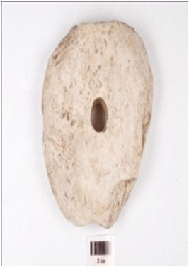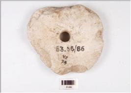 | Description / विवरण | A macehead made of lime stone, discular shape, chipped off on the surface and perforated. |