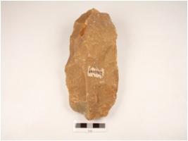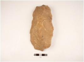 | Description / विवरण | A hand axe made on quartzite, uneven surface, prepared platform on proximal end. |