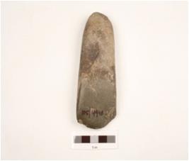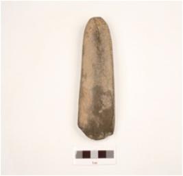 | Description / विवरण | Basalt celt, sharp and convex cutting edge, narrow butt, smooth and polished surface. |