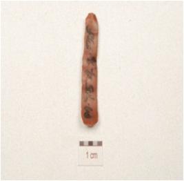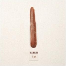 | Description / विवरण | A chert blade with two blade scars on dorsal, striking platform, slightly chipped off diffused bulb on ventral, trapezoidal cross section and use wear marks on cutting edge. |