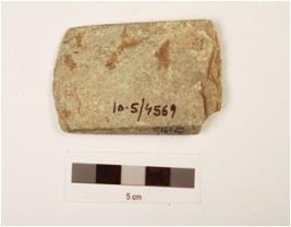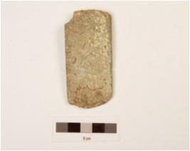 | Description / विवरण | A broken piece of axe, made on stone, flat surface and polished with one working edge and rectangular cross section. |