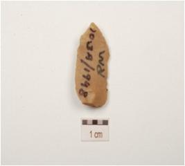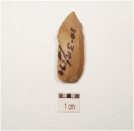 | Description / विवरण | A blade, made on end struck chert, prominent bulb on the ventral side, midridge on the dorsal side and retouched along cutting edges. |