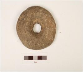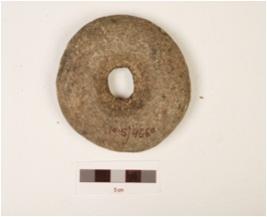 | Description / विवरण | A basalt Mace head, round in shape, uneven surface with perforation. |