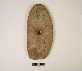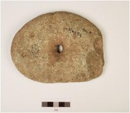 | Description / विवरण | A oval shape mace head, made on basalt, uneven shape perforated on center and not polished. |
