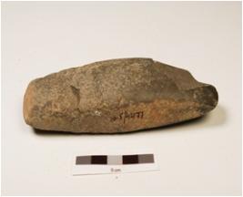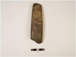 | Description / विवरण | A basalt cell with rectangular butt and bevelled edge, broken towards the edge, polish surface along the working edge and rough surface. |