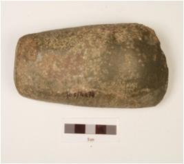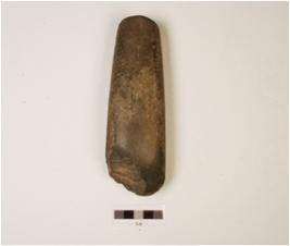 | Description / विवरण | A basalt celt with rounded butt and bevelled edge broken one edge visible polish along the working edge and partly rough surface. |