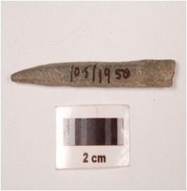 | Description / विवरण | Fragment of a point stone, slightly broken at one end, pointed broken at other end, triangular in section, greyish colour, smooth surface. |