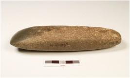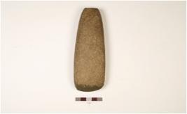 | Description / विवरण | A long basalt celt, with angular and flat butt, bevelled edge, fully polished surface visible polish along the working edge and rough surface. |