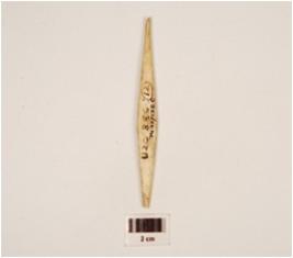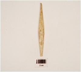 | Description / विवरण | A bone point, pointed ends, surface is rough slightly flat from centre and irregular section. |