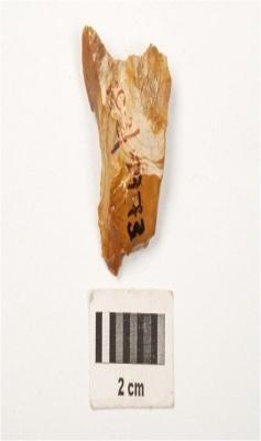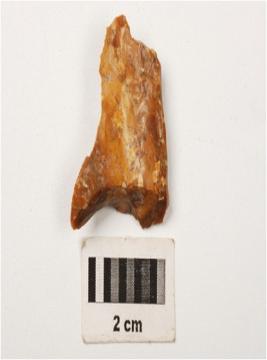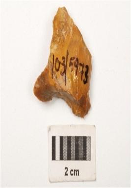 | Description / विवरण | A scraper made on chert, flake scars on dorsal side, prepared platform, use wear marks on cutting edges, smooth surface. |