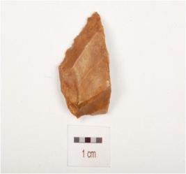 | Description / विवरण | Chert, scapper on core, prepared platform, six blade scars with ripple marks on surface, retouches on cutting edge and brown in colour. |