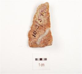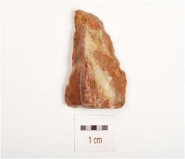 | Description / विवरण | Chert, side scraper on end struck flake with a mid ridge and flake scars on dorsal side, prepared platform, diffused bulb on ventral side, irregular retouches on cutting edge and triangular in section. |