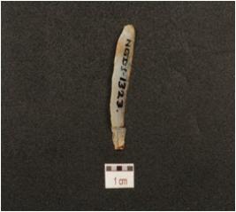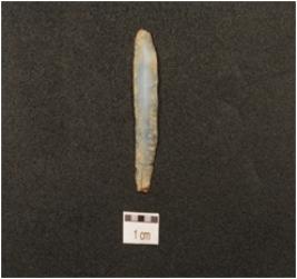 | Description / विवरण | Fragment of chalcedony blade with prominent mid ridge on dorsal, triangular cross section, striking platform and use wear marks on right cutting edge. |