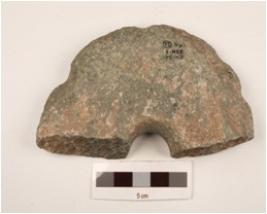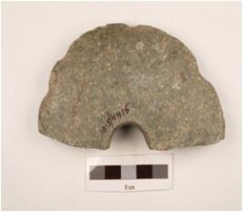| Description / विवरण | A fragment of mace-head made on basalt, polished surface, traces of perforation and slightly broken from edge. |