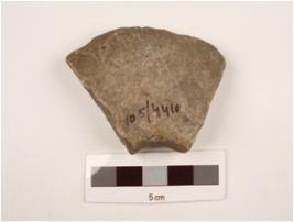 | Description / विवरण | A fragment of mace-head made on basalt, polished surface, traces of perforation and slightly broken from edges. |