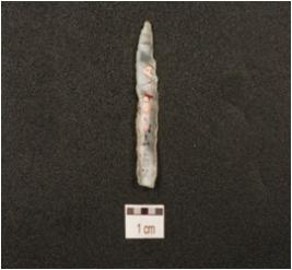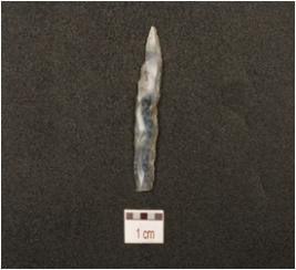 | Description / विवरण | A chalcedony blade with mid ridge on dorsal, triangular cross section, irregular retouched on cutting edge and prepared platform. |