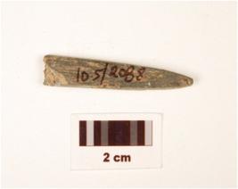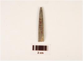 | Description / विवरण | A stone long point with polished surface, pointed one end other end broken, plano convex in section and grey in colour. |