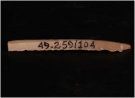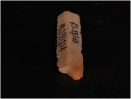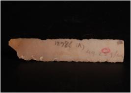 | Description / विवरण | A chert blade with flaked marks on dorsal side and a ridge in the middle. Slightly curved and broken at one end. |