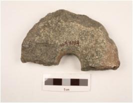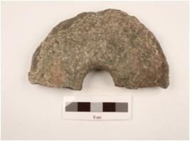| Description / विवरण | A fragment of mace-head with rough surface, traces of perforation, slightly broken from edges. |