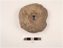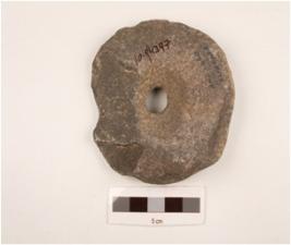 | Description / विवरण | A ring stone made on basalt with polished surface, hole broade at the top and narrow at the bottom, partly broken from surface. |