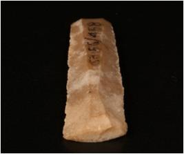 | Description / विवरण | A chert blade, parallel sided with two ridges on the dorsal side. Slightly chipped off at one end,cutting edges intact. |
