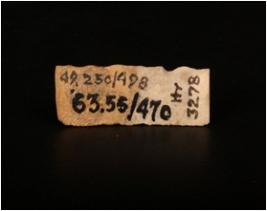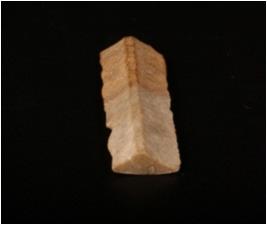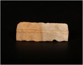 | Description / विवरण | A blade of chert with two parallel ridges on the dorsal side, slightly chipped off at one cutting edge. |