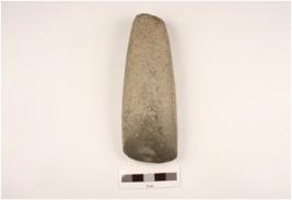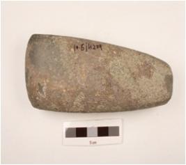 | Description / विवरण | Basalt stone trangular shaped celt with rounded butt end, convex polished cutting edge and rough surface. |