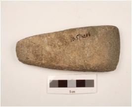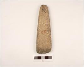 | Description / विवरण | Basalt stone triangular shaped celt with convex cutting polished edge, rough surface, rounded butt end and convex both surface. |