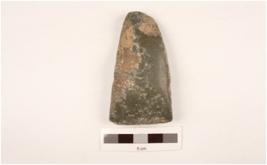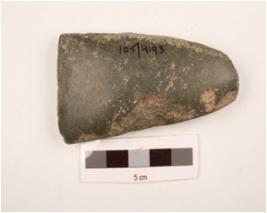 | Description / विवरण | Basalt stone triangular shaped celt with polished surface, straight cutting edge, rounded butt end, partly damaged surface and two lateral sides are thick. |