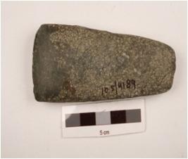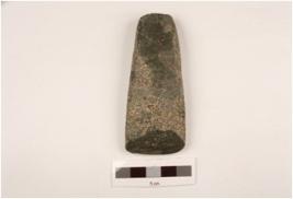 | Description / विवरण | Basalt triangular shape adze, flat on one surface other is slightly convex, rounded butt end, polished cutting edge and partly rough surface. |