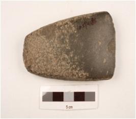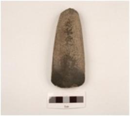 | Description / विवरण | Basalt triangular shaped adze with broad polished cutting edge, rough surface and rounded butt end partly damaged. |
