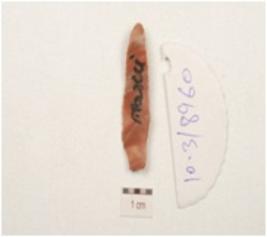| Description / विवरण | A blade made on chert, prepared platform on proximal end, use wear marks on working edges, triangular cross section and bulb on ventral side. |