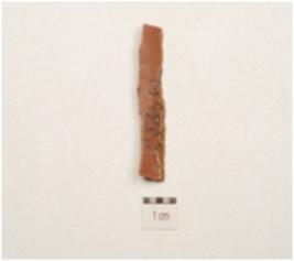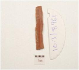 | Description / विवरण | Fragment of a chert, blade, prepared platform on proximal end, double ridge on dorsal side, use wear marks on working edges and trapezoidal cross section. |