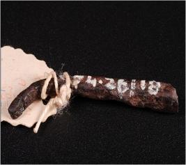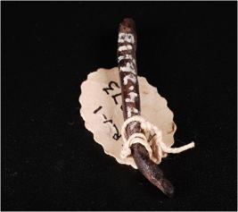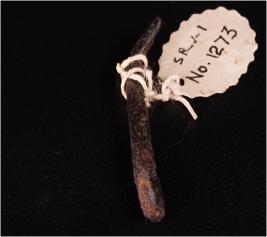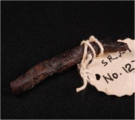 | Description / विवरण | Fragment of a iron nail, headless, round section, tapering from the lower portion and broken tip, Chemically treated, black in colour. |