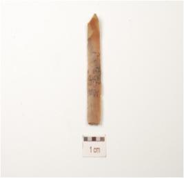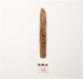 | Description / विवरण | A blade made on chert, prepared platfrom, double ridge on a dorsal and diffused bulb on ventral use wear marks along the cutting edges and trapizoidal in section. |