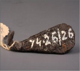 | Description / विवरण | A flat thin piece of iron, probably a spatulae. Slightly banded from top and spherical from the bottom. |
