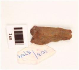 | Description / विवरण | Flake stone tool made by chert, two blade scars on the surface, prepare platsform proxmely, irregular shape. |