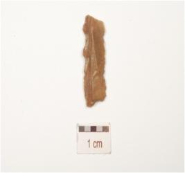 | Description / विवरण | A blade made on chert, ridge on a dorsal triangular in section, broken from proximal and distal end and use wear marks along the cutting edges. |