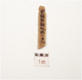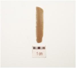 | Description / विवरण | A fragment of blade made on chert, ridge on a dorsal and triangular in section, use wear marks along the cutting edges and broken from distal and proximal end. |