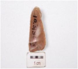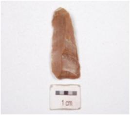 | Description / विवरण | A utilized flake made on chert, end struck flake, prepared striking platform on proximal end, diffused bulb on ventral use wear marks on cutting edges, partly retouched, blade scars on dorsal and triangular cross section. |