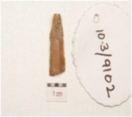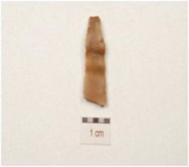| Description / विवरण | A fragment of blade made on chert, prominent bulb on the ventral and ridge on dorsal and retouched cutting edge. |